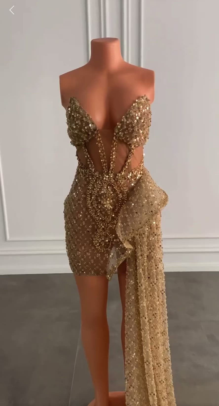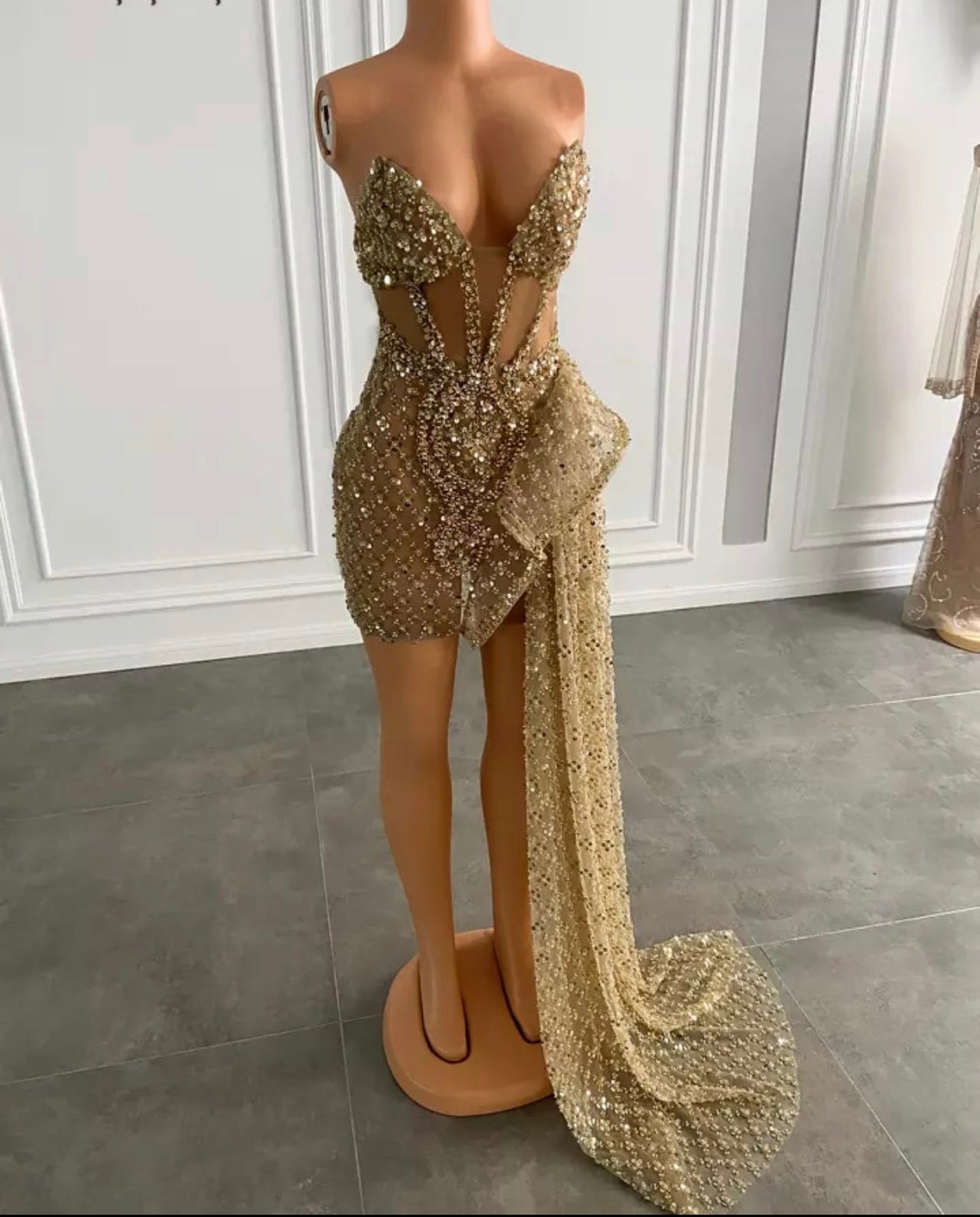 Real Sample See Through Stunning Gold Sequined Beaded High Low African Black Girls Short Prom Dresses 2022