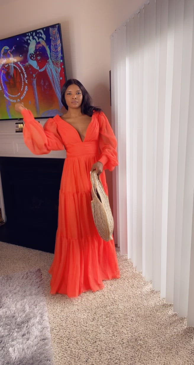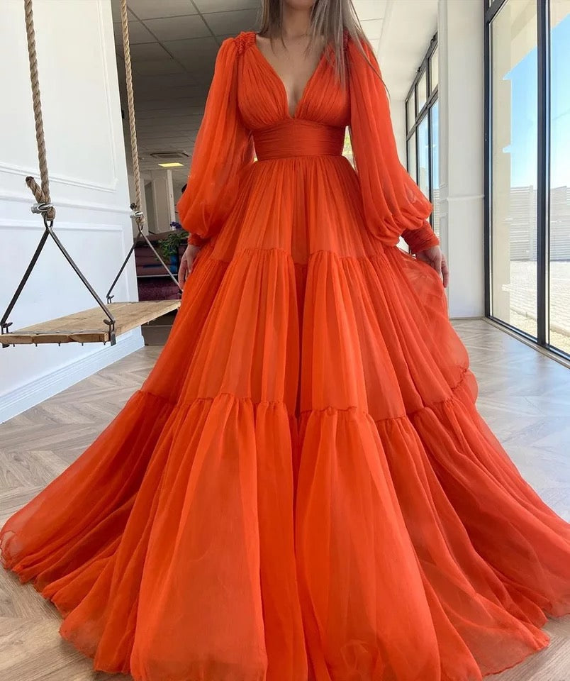 Long Puff Sleeves Prom Dresses V-Neck Pleats Chiffon Princess Evening Gowns Women Party Dress Plus..