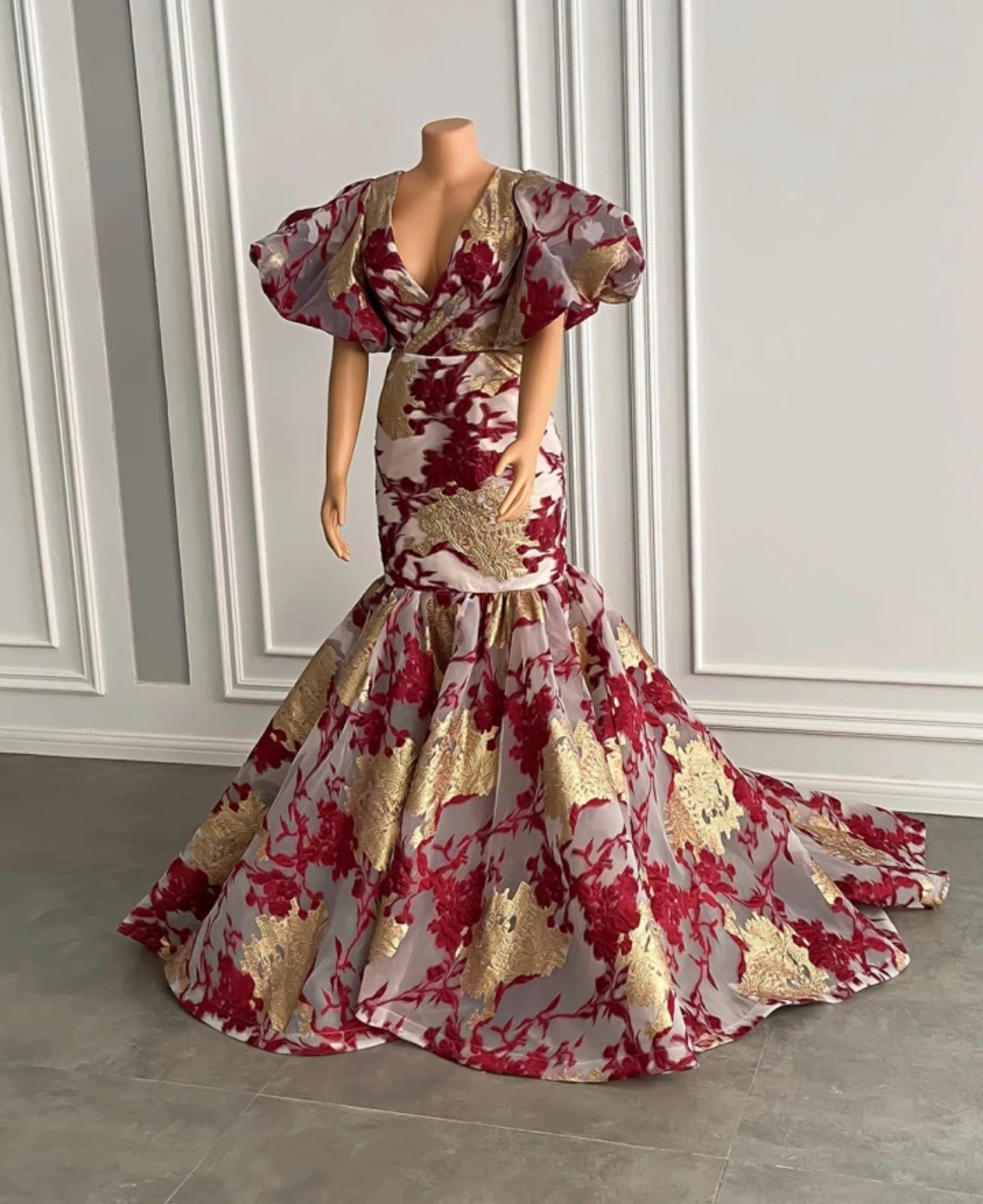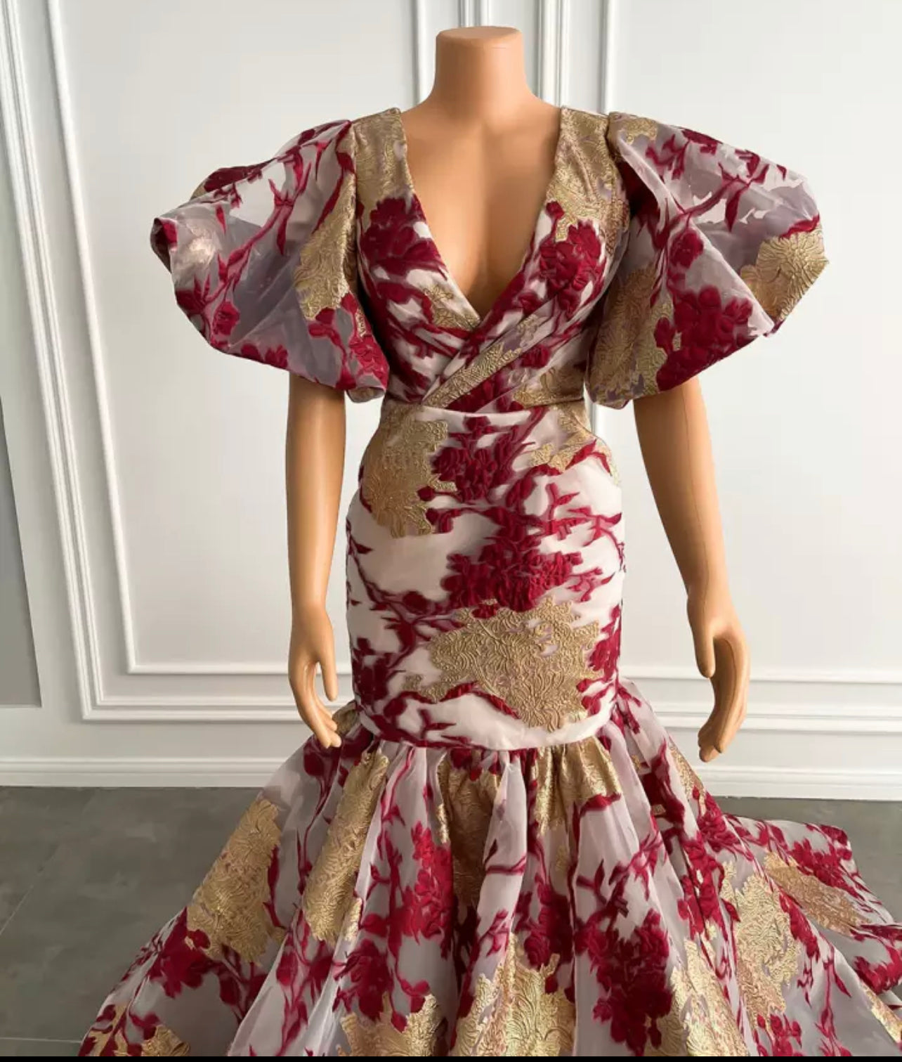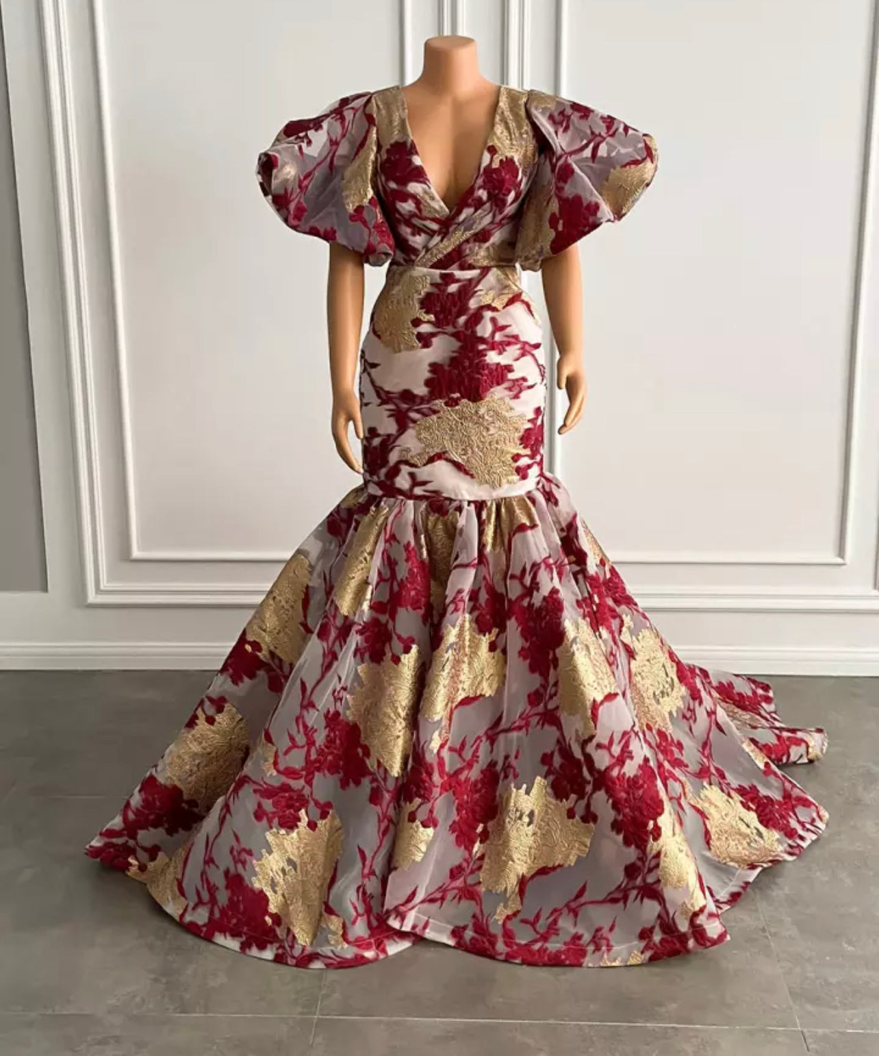Luxury Long Arabic Evening Dresses Puffy Short Sleeve Mermaid Gold And Burgundy African Women Party Formal Gowns.