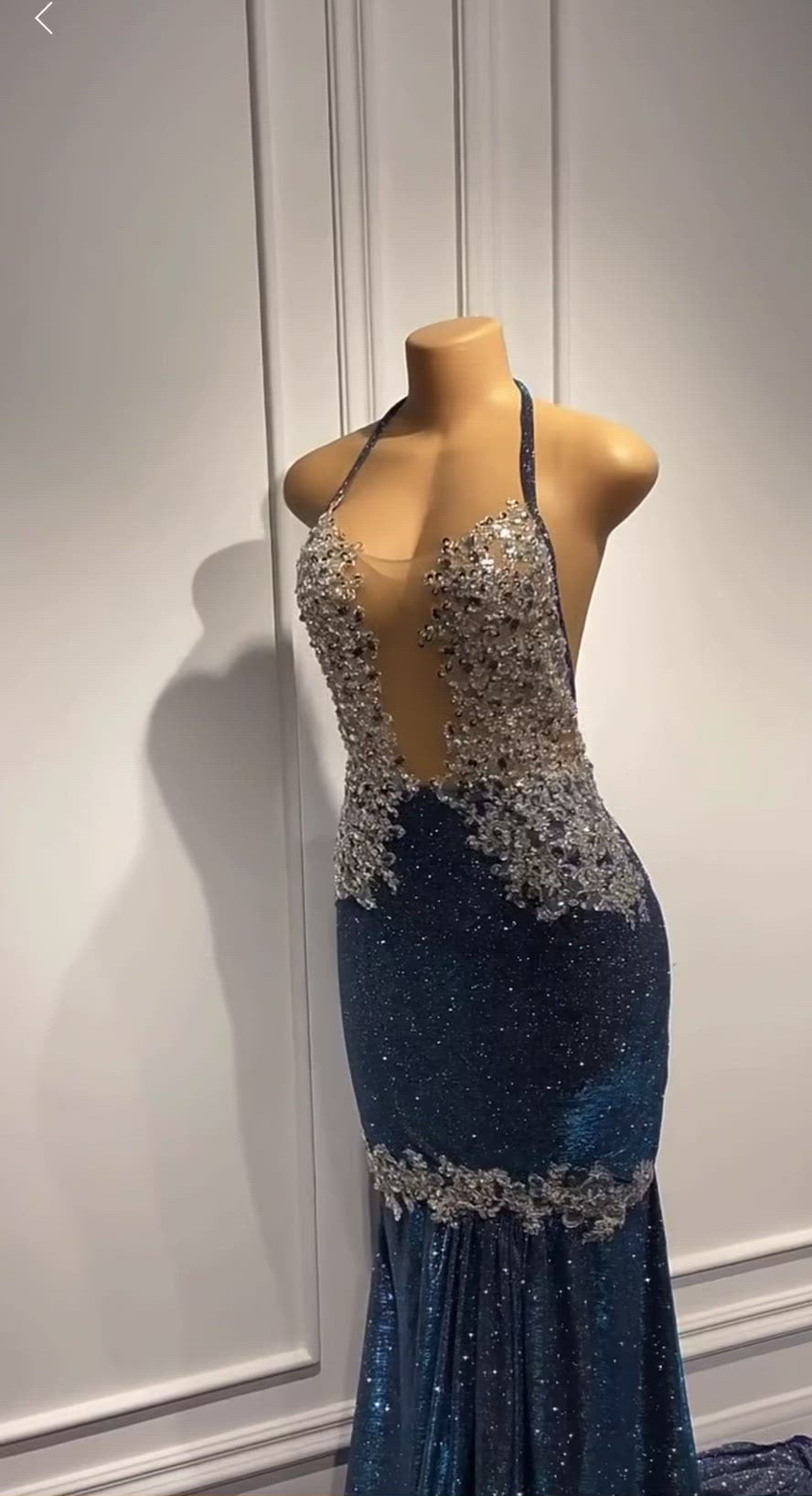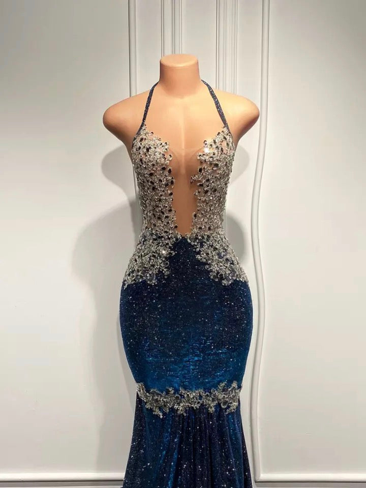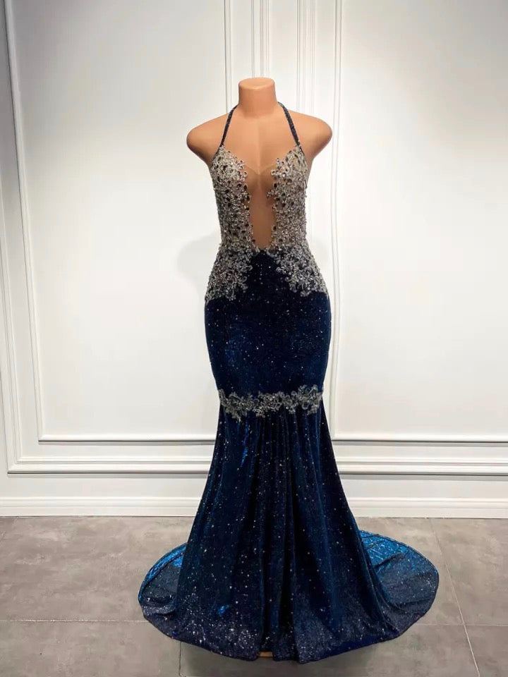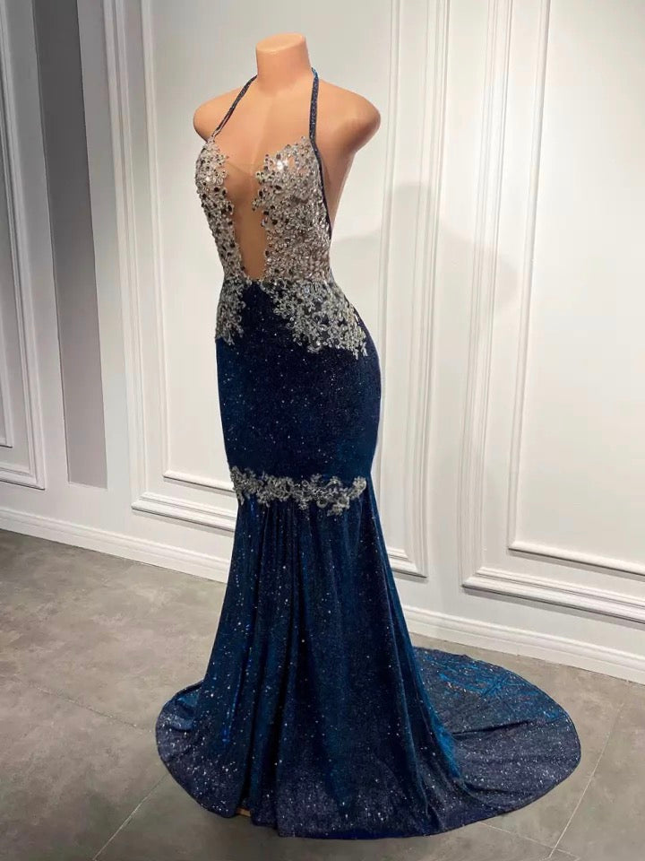 Long Prom Dresses 2022 Sparkly Sexy Mermaid Halter Glittery Beaded Lace African Women Black Girl Navy Blue Prom Party Gowns
